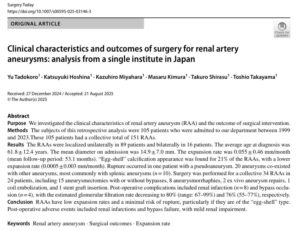 の論文です。腎動脈瘤のサイズと拡張速度に関する論文です。ご一読ください。
